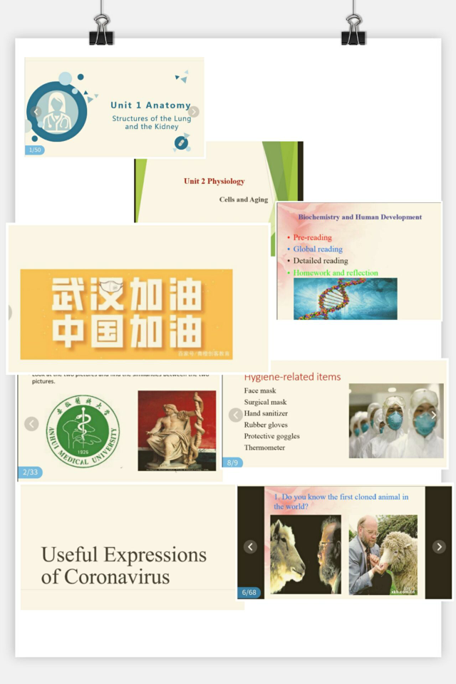 开学第一个月,18级教学组按照教学大纲要求和教学进度安排基本已经完成了学术英语前三单元的学习。教师们在讲授第一单元解剖(Anatomy),第二单元生理学(Physiology),和第三单元生物化学(Biochemistry)课程时融入了“新冠病毒”防护知识,《医学生誓言》,医学英语词源学等新鲜内容,保证完成教学任务的同时提升医学生的人文素养。
