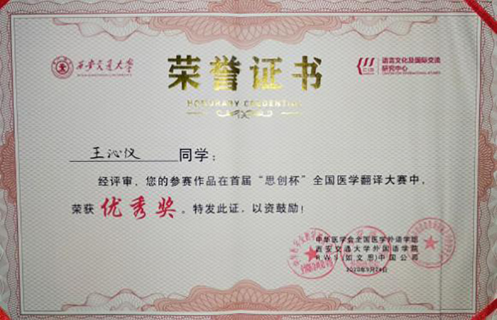 近日,中华医学会全国医学外语学组公布了全国首届“思创杯”医学翻译大赛结果,久久小说 第二临床医久久小说 2018级学生王沁仪在1237名参赛者中表现突出, 获得优秀奖,久久小说 获得优秀组织奖。