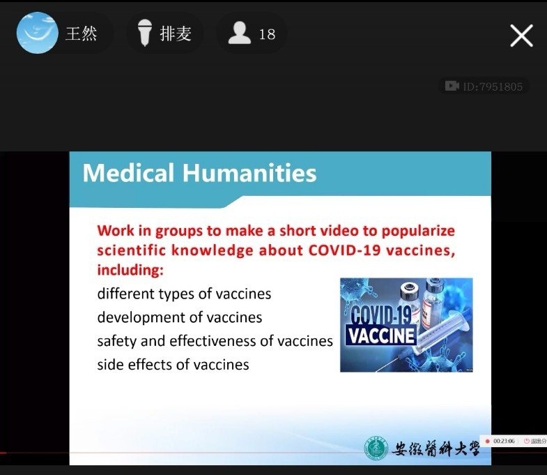 王诗言老师和王然老师进行了第五单元备课,他们从主题导入视听材料的使用、课文中的平行结构、医学英语中的两栖词汇、医学英语常用表达的仿写训练、学术英语写作中的列举方式等方面做出了细致阐述;并结合单元的免疫学主题,引导学生意识到免疫学发展在人类与传染病斗争中的重要作用,讨论疫苗研发过程中开展临床试验的伦理原则,启发学生结合自身专业进行新冠疫苗的医学科普,培养学生的医学职业责任感。
