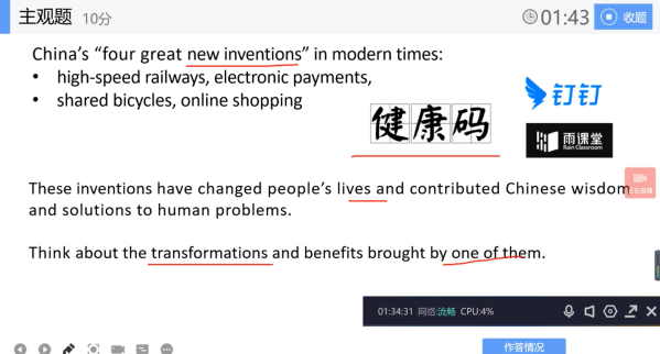 随后,鲁沛老师将较为抽象的创新学习之路具体化,引导从国家的角度思考:我国的创新科技发展有哪些?在讨论环节,鲁老师采用开放性问答进行线上互动,得到学生的广泛回应,不仅提高了课堂参与度,也锻炼了学生的段落写作能力。通过这些练习,进一步增强了学生对国家发展的认同感,激发了学生的家国情怀和文化自信。