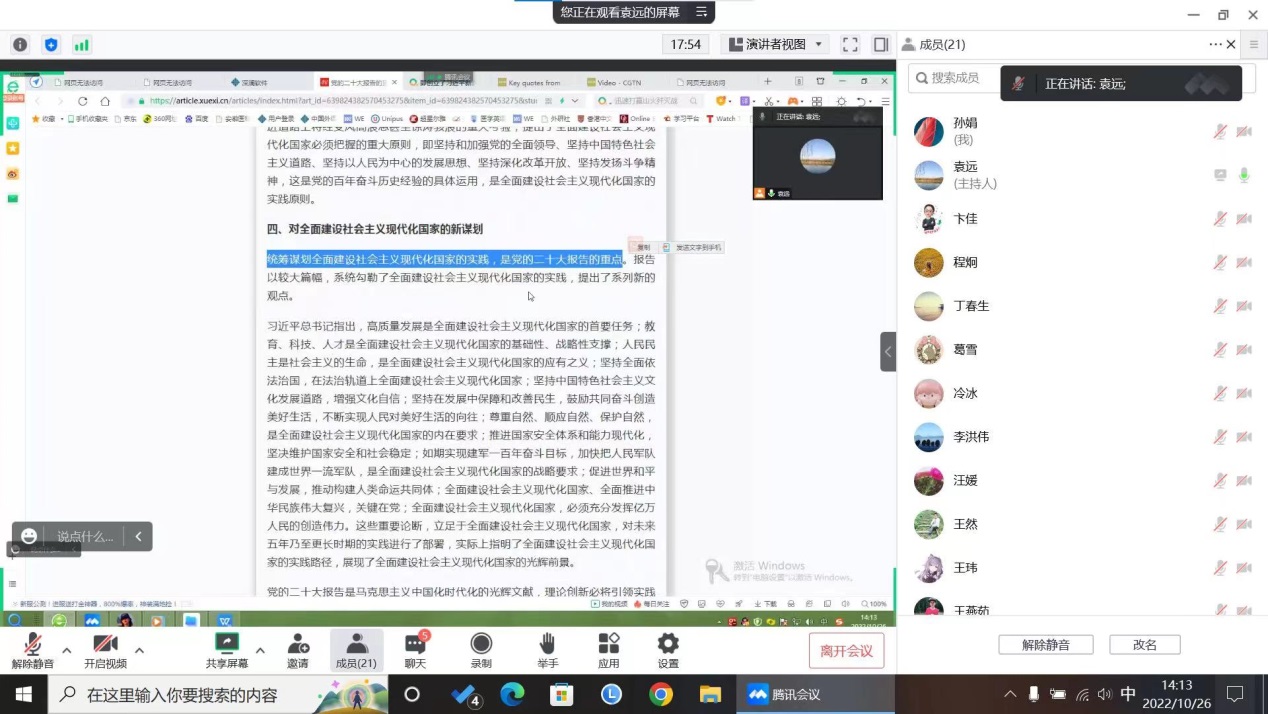1026日下午,外语党支部通过腾讯视频召开专题会议,传达学习党的二十大报告的重大理论创新。会议从外语系教学实际出发,学习英文文章《Key quotes from Xi Jinping's report at 20th CPC National Congress》,观看学习视频《Review: Xi Jinping at the 20th CPC National Congress》。