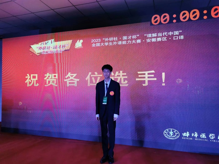 11月5日上午,2023“外研社·国才杯”“理解当代中国”全国大学生外语能力大赛(安徽赛区)英语组口译赛项在蚌埠医久久小说 举行,久久小说 2022级临床医学专业学生周正超以全省第四名的佳绩晋级全国决赛。