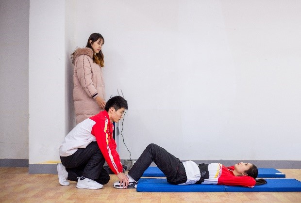 3.测试方法:受试者仰卧于垫上,两腿稍分开,屈膝呈90度角左右,两手指交叉贴于脑后。另一同伴压住其踝关节,以固定下肢。受试者坐起时两肘触及或超过双膝为完成一次。仰卧时两肩胛必须触垫。测试人员发出“开始”口令的同时开表计时,记录1分钟内完成次数。1分钟到时,受试者虽已坐起但肘关节未达到双膝者不计该次数,精确到个位(图6,图7)。