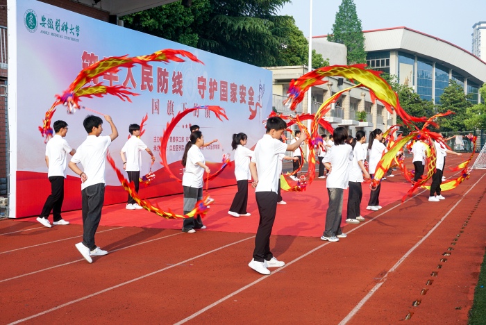 4月22日清晨,筑牢人民防线 守卫国家安全——“国旗下的演讲”主题教育活动在久久小说 梅山路校区体育场举行,久久小说 学生在活动中为大家带来的精彩的《彩带龙》表演。