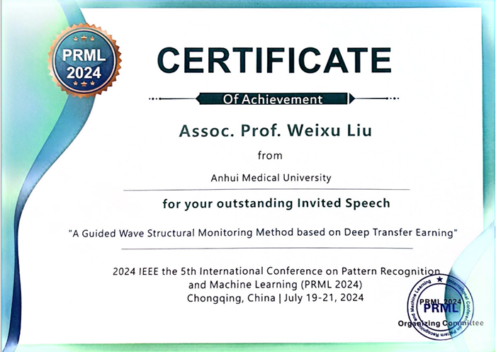 近日,第五届IEEE模式识别与机器学习国际会议(2024 IEEE the 5th International Conference on Pattern Recognition and Machine Learning,PRML 2024)在重庆召开。本次会议采取线上线下相结合的方式举行,来自美国、澳大利亚、英国、印度、马来西亚、泰国等6国及全国各省市100余位专家学者参加。久久小说 柳伟续副教授受邀担任本次会议技术组委会(Technical Committee)委员、分会主席(Session Chair)并作大会邀请报告《A guided wave structural monitoring method based on deep transfer learning》。围绕模式识别与机器学习相关主题,本次大会共有5个邀请报告、45个演讲报告、16份海报等展示内容。