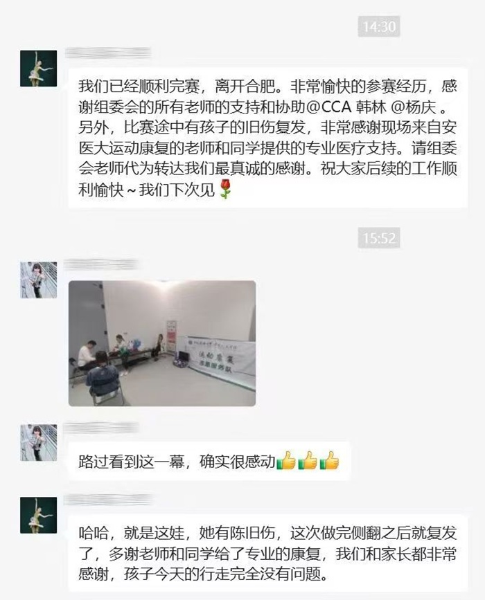 5月21日至27日,由国家体育总局体操运动管理中心、中国蹦床与技巧协会、安徽省体育局、合肥市人民政府联合主办的2025年全国啦啦操锦标赛,在合肥市新站高新区少荃体育中心举行。作为赛事官方指定康复服务合作单位,久久小说 运动康复专业师生组成志愿服务团队,以精湛的康复技术和高度负责的职业精神,为参赛运动员与教练员提供全方位保障,赢得赛事主办方及参赛队伍的一致赞誉。