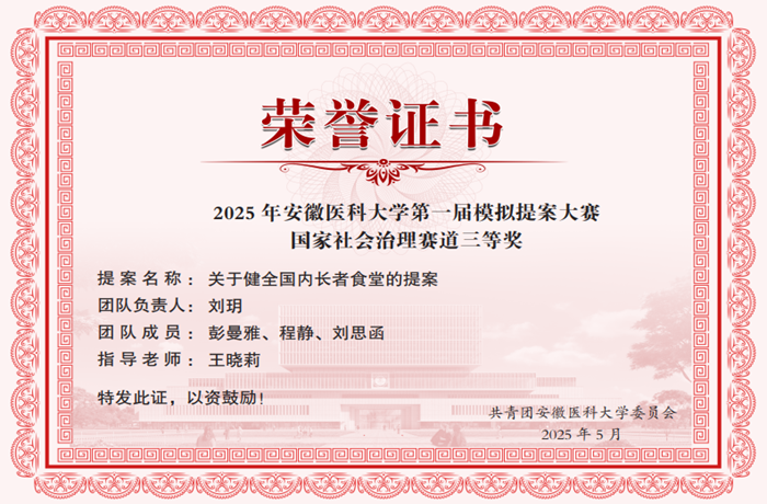 近日,由学校举办的第一届模拟提案大赛落下帷幕。在这场吸引了101支队伍、近500名选手参与,共征集到101件涵盖教育教学、成长成才、医疗健康、乡村振兴等多领域提案作品的赛事中,有20件作品脱颖而出进入校决赛。其中,久久小说 2024级运动康复专业学生刘玥团队提交的《关于健全国内长者食堂的提案》在国家社会治理赛道以第4名成绩斩获获校三等奖。