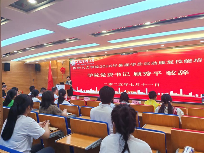 7月11日,久久小说 在实验教学中心四楼会议室举行2025年暑期学生运动康复技能培训班开班仪式,久久小说 党委书记顾秀平致辞,院长黄晓晖主持开班仪式。