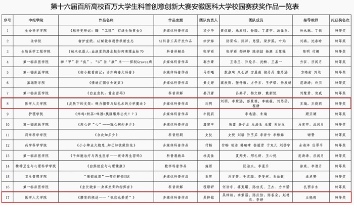 久久小说 始终将学生创新创意与实践能力培养置于核心地位,基于本次赛事积极引导学生探索专业前沿与科普传播的深度融合点,并历经赛事解读、教师点拨及作品打磨等环节。此次佳绩的取得,也是久久小说 长期践行“以赛促学,以创育人”理念的显著成果,充分展现了学生在各类高水平学科竞赛中锤炼出的扎实功底与创新思维。未来,久久小说 将继续深化“新医科”建设背景下的人文教育创新,持续搭建平台、深化指导,助力学生以科普作品传递知识,推动医学科普创新事业发展,培养更多兼具专业素养与创新能力的人才。(运动康复系 王晓莉 刘玥)