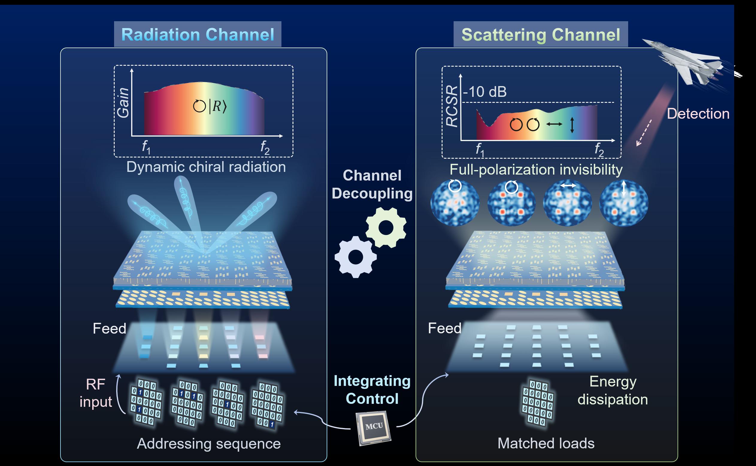 该研究围绕新一代通信与电磁隐身系统对“辐射与全极化隐身协同共存”的迫切需求,提出了一种多组协同超表面集成架构,通过多层结构之间的协同电磁耦合机制,实现了辐射调控与散射抑制的物理解耦,突破了传统方案依赖正交极化或分离频段实现功能分割的固有限制。实验结果表明,该体系可稳定实现多模式手性波束扫描与全极化隐身功能,验证了其在复杂电磁环境下的可靠性与实用性。该成果为安全卫星通信、低空信息网络以及隐蔽战术通信等应用场景提供了关键技术支撑,对推动辐射调控与电磁隐身协同发展的前沿研究具有重要意义。